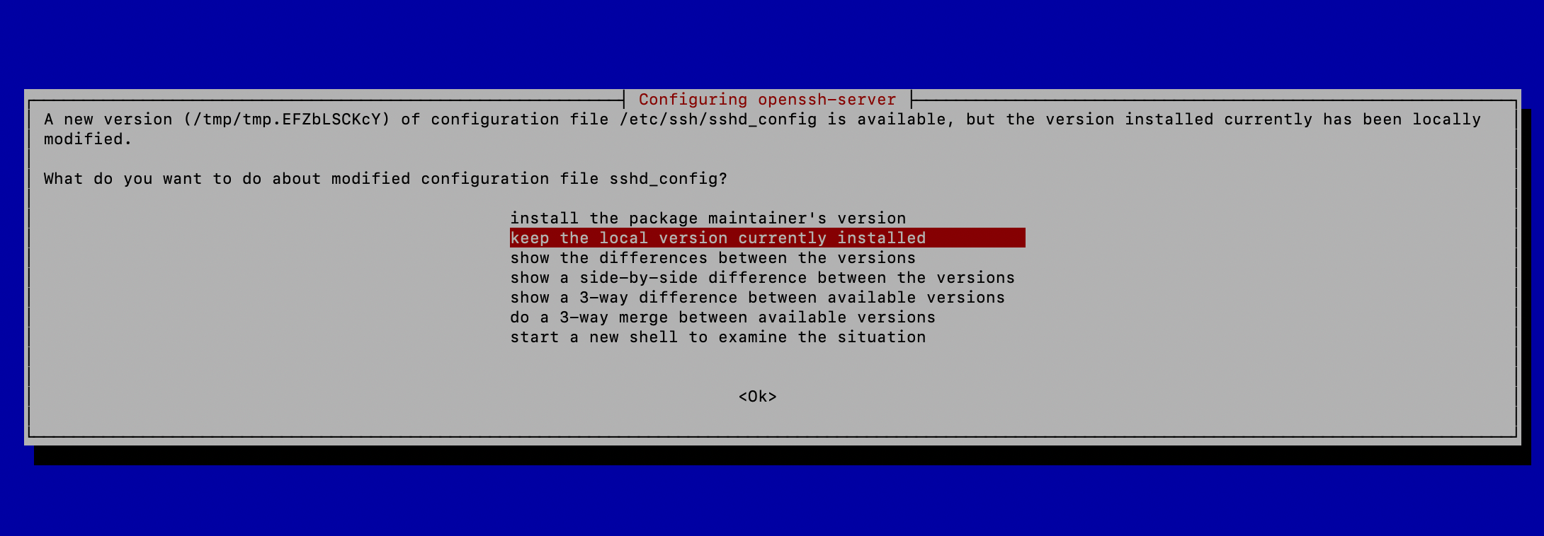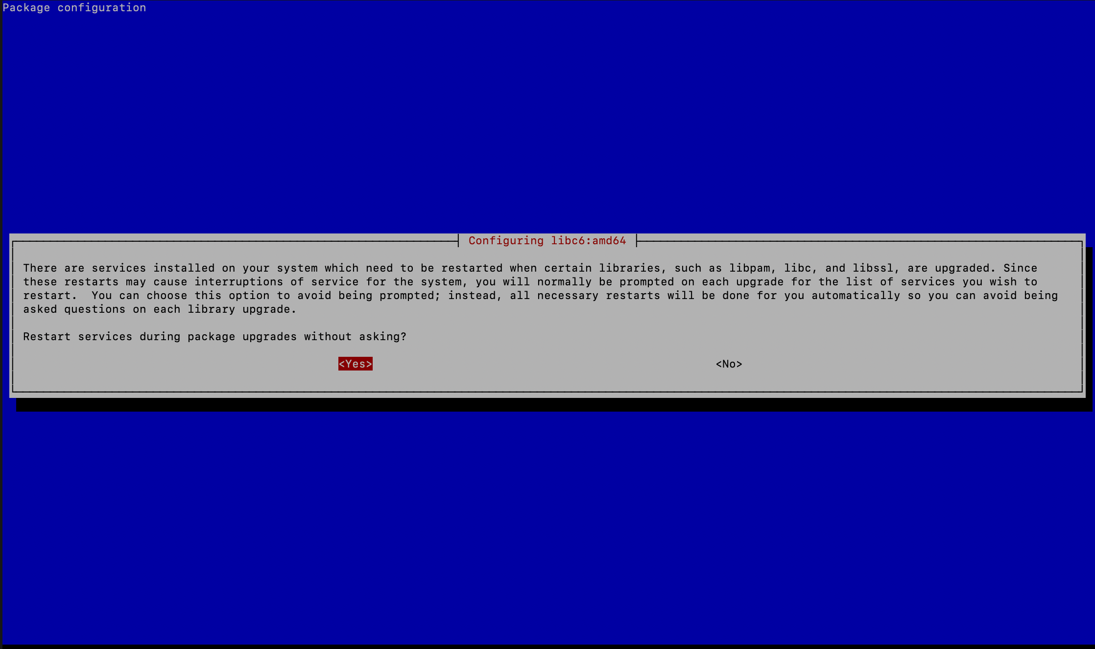 更新过程种会提示一些软件是否需要自动重启,选 Yes 即可,以及一些软件的配置文件是否需要更新,按照自己的情况选择即可,默认回车即视为使用旧的配置文件,一般会出现在 OpenSSH 等软件的更新上。